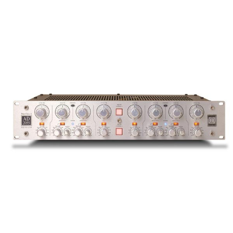 Двухканальный параметрический эквалайзер AD 2055 имеет на каждом канале пассивный шельфовый фильтр низких частот (18, 25, 30, 50, 72, 100, 150, 215, 300 или 450 Гц), активный параметрический эквалайзер низкой середины (от 35 до 450 Гц, переключается на диапазон от 350 до 4500 Гц) с регулятором добротности, активный параметрический эквалайзер высокой середины (от 160 до 2000 Гц, переключается на диапазон от 1,6 до 20 кГц) с регулятором добротности, пассивный шельфовый фильтр высоких частот (1,5, 2,5, 3,5, 5, 7,2, 10, 12,5, 15, 20 или 25 кГц), кнопку релейного обхода эквалайзера. Входы и выходы симметричные (XLR). Высота устройства - два рэка, масса - 13,6 кг.