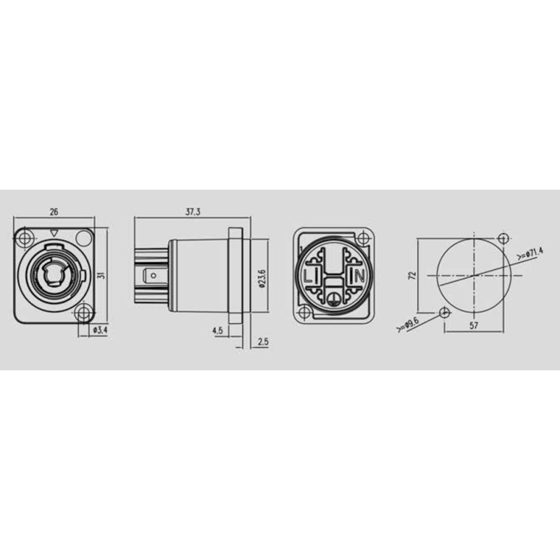 Используется для питания звукового оборудования: пассивные акустические системы, усилители и т.п. Индивидуальная установка, контакты под пайку. Материал корпуса полиамид серого цвета, расчетное количество рабочих циклов (соединить/рассоединить) составляет не менее 1000. Фланец типа D.
