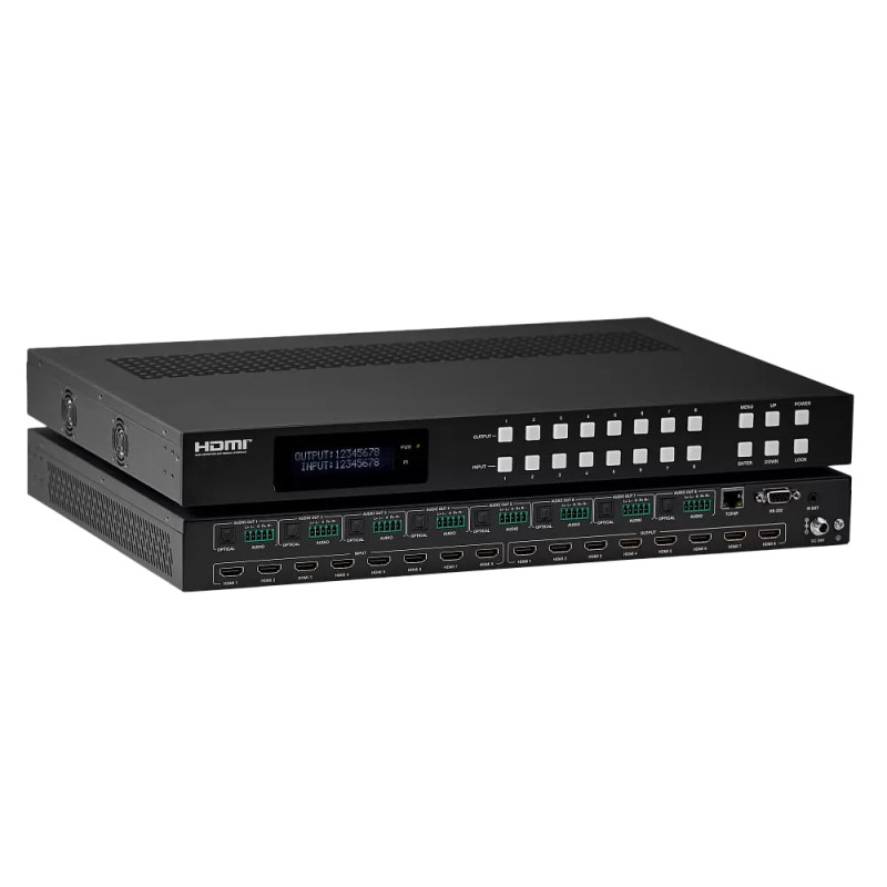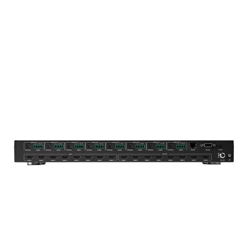 Входы: 8 x HDMI. Выходы: 8 x HDMI. Максимальное разрешение: 4K@60Гц. Управление с помощью кнопок, RS-232, ИК, GUI. Позволяет выбирать и устанавливать разрешения видеосигналов; конфигурировать видеостены с возможностью и регулировкой компенсации ширины рамки; выбор аудиоисточника для видеосигнала. Поддержка CEC.