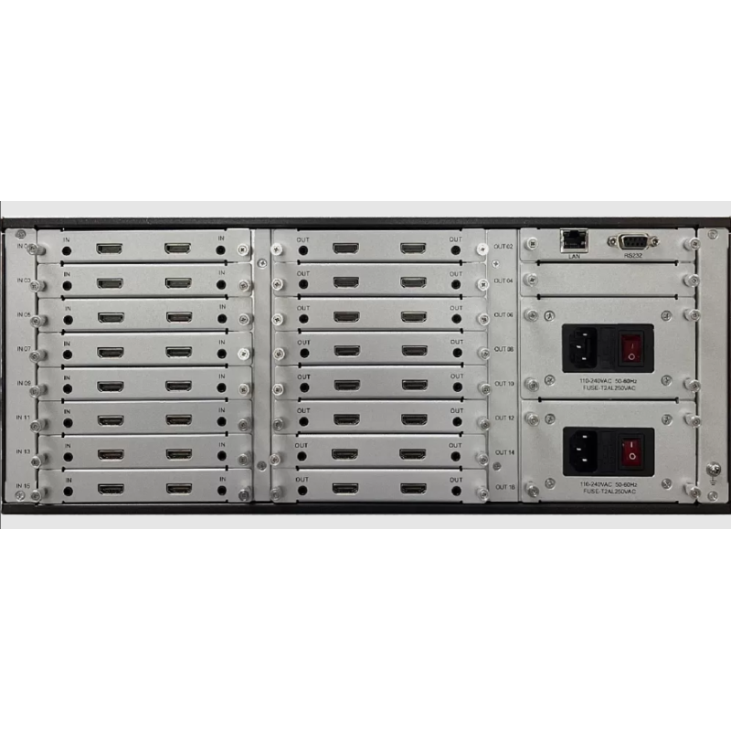 Всего предусмотрено 16 слотов для плат: восемь (8) входных и восемь (8) выходных. Каждый слот оборудован двумя контактами цифрового стандарта HDMI: входные и выходные (16 х 16 каналов); звук выводится через аналоговый разъём Jack 3.5 мм. Встроенное меню позволяет производить независимо на каждом из выходов следующие настройки видеосигнала: контрастность, яркость, чёткость, уровень насыщенности цвета и глубину цветовой компенсации. Управление работой устройства и все настройки либо вручную через дисплей и элементы управления на лицевой панели корпуса, либо дистанционно, для чего прибор подключается по сетевым коннекторам 1х RS-232 и 1x RJ-45.