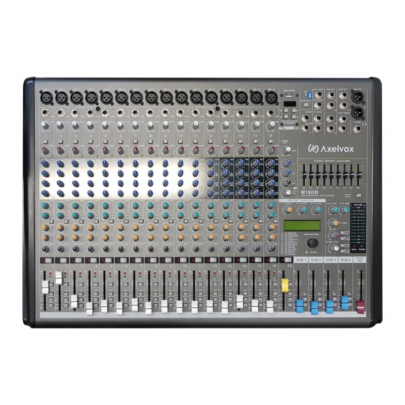 Axelvox M16DB аналоговый микшерный пульт, предлагающий широкий функционал микширования. Например, микширование FOH, мониторинга и матрицы входов (16 микрофонных/16 линейных входов). Кроме того, имеется графический эквалайзер на девять полос, процессор эффектов, проигрыватель USB и модуль Bluetooth для воспроизведения музыки с портативных устройств. Корпус прочный и компактный, что делает микшер подходящим звукорежиссерам, которым нужна профессиональная модель небольшого размера и с большими возможностями.