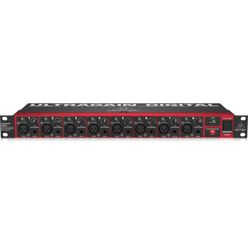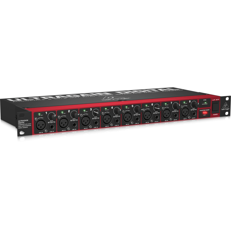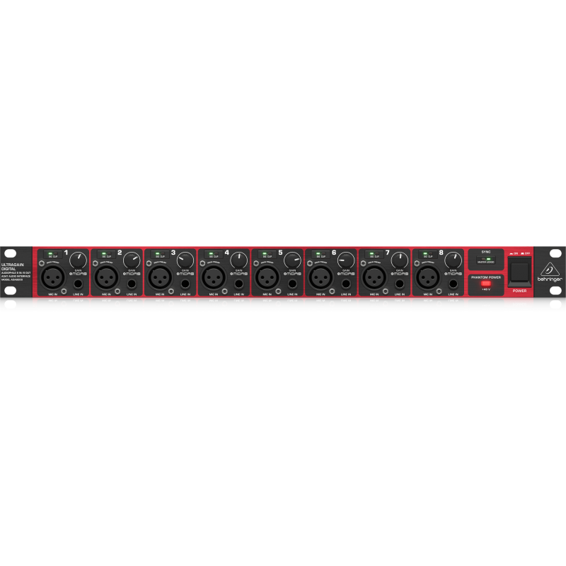 8-канальный ADAT конвертер с микрофонными предусилителями MIDAS. Качество: 44.1/48 кГц, 24 бита. Возможность синхронизации по Word Clock или ADAT. Вход: 8 микрофонных входов XLR с фантомным питанием, 8 балансных линейных входов TRS, оптический ADAT вход. Выход: 8 балансных выходов XLR, оптический ADAT выход. Высота: 1U