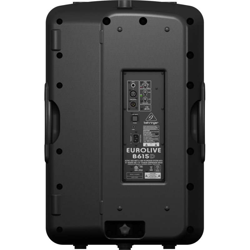 Behringer EUROLIVE B615D – активный двухполосный концертный громкоговоритель серии EUROLIVE, содержащий в себе встроенный процессор DSP, усилители мощности класса D, а также малошумные входы. Одна из изюминок модели – схема двойного усиления, отдельно усиливаются сигналы на нижнечастотный канал, отдельно – на верхние частоты.