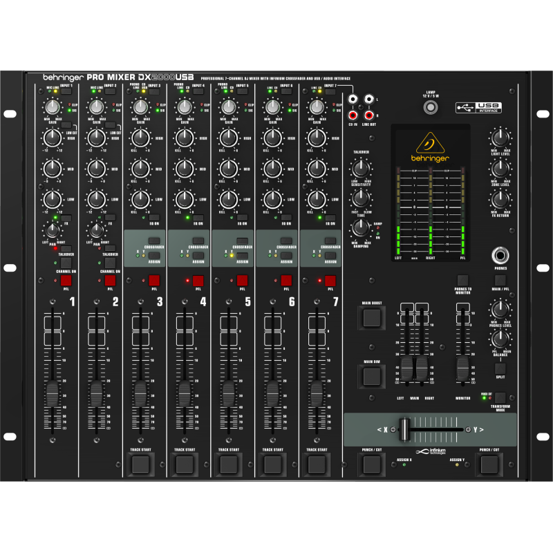 Каждый из семи каналов в Behringer DX2000USB обладает собственным трехполосным kill-эквалайзером и ручкой регулировки гейна. Монофонические каналы имеют переключатель НЧ-обрезки и переключатель FX, который направляет канал к в посылы и возвраты, так что вы можете добавить внешние эффекты. На первых двух каналах дополнительно есть ручки регулировки паннинга и кнопки TALKOVER для включения перекрытия звука с микрофона, и громкость данного звука перекрытия можно регулировать с помощью одноименной ручки справа от каналов. Каналы с 3 по 7 возможно назначить на кроссфейдер, для чего они снабжены кнопками ASSIGN и CROSSFADER. Канал 7 имеет четыре дополнительных разъема RCA: два из них – входы CD in и два - выходы Line out. К микшеру можно подключать лампу 12В/5Вт, для чего он снабжен BNC-входом сверху над тройным 12-сегментным индикатором уровня (для каждого из двух стереоканалов + канал в наушниках). Наушники подключаются на фронтальной панели в разъем 1/4" TRS Jack справа от индикатора уровня. Есть два микрофонных предусилителя с фантомным питанием для каждого из микрофонных каналов. Можно подключать до трех виниловых вертушек благодаря встроенным фонокорректорам.