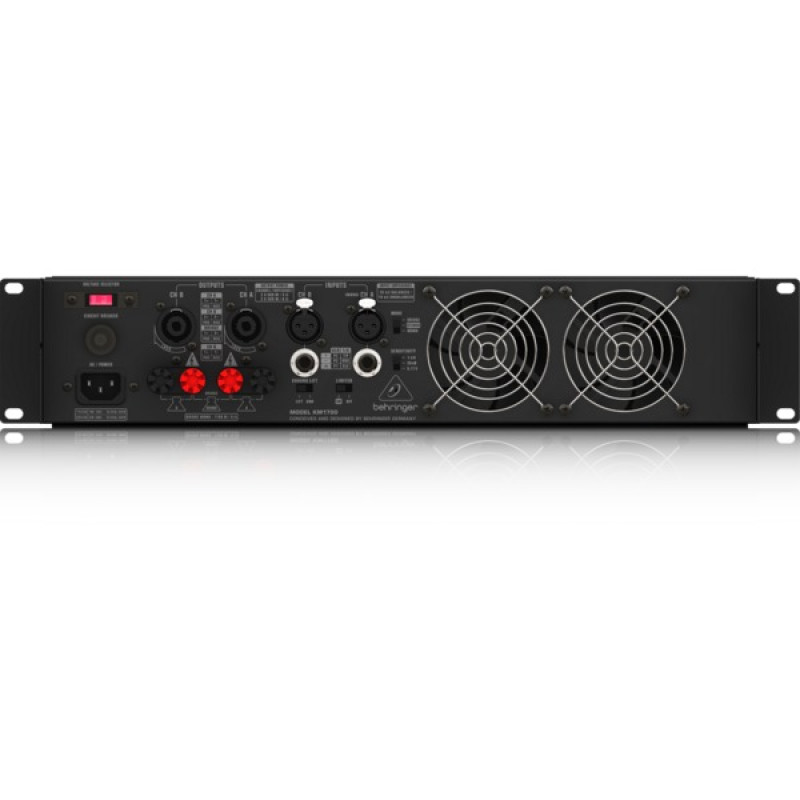 Выходная мощность Behringer KM1700 зависит от нагрузки и может достигать 1700 Вт в мостовом режиме с нагрузкой 8 Ом. Входные подключения производятся с использованием XLR, 6.35 мм TRS Jack (балансные и небалансные подключения), выходы представлены двумя разъемами Neutrik Speakon. Входы и выходы расположены на тыловой панели, где представлены и функциональные переключатели: устранения петли заземления, лимитера, режимов (моно, стерео, мост) и входной чувствительности. Вентиляция в усилителе осуществляется по сквозному принципу: воздух проходит сквозь усилитель от фронтальной до тыловой панели.