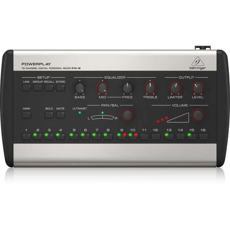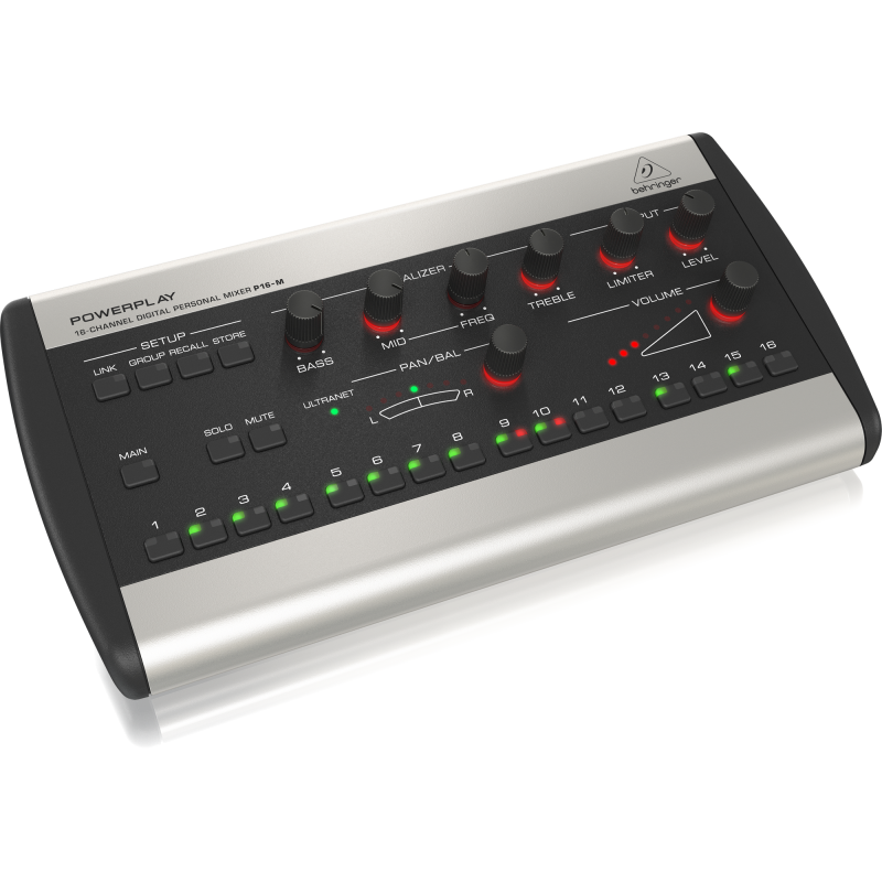 Behringer POWERPLAY P16-M – это 16-канальный микшер, который является частью системы персонального мониторинга, используемой в студийной работе для лучшей организации одновременной записи или репетиции большого числа партий.
