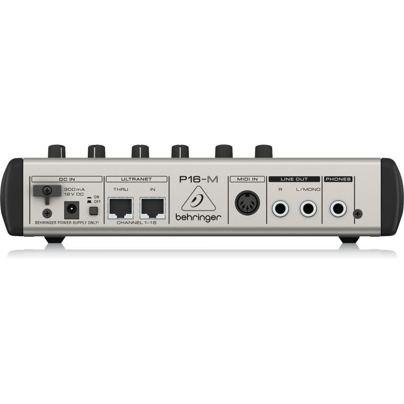 Behringer POWERPLAY P16-M принимает цифровой сигнал через сеть Ultranet. Для подключения к ней микшера используется стандартный Ethernet-кабель CAT5 RJ45. Кроме того, есть выходной Ultranet-разъём для подсоединения других цифровых аудиоустройств. Входной MIDI-разъём позволяет организовать удалённое управление микшером. Выходные разъёмы выполнены на TS 1/4" Jack, разъемы для наушников – стандартный TRS 1/4" Jack. Также для каждого канала доступны эквалайзеры: это один общий трехполосный (4 ручки, 2 – для средних частот). Можно менять громкость и стереофонический баланс для каждого канала с помощью отдельных ручек. Контроллеры панорамирования и громкости имеют светодиодные шкалы, а все кнопки и поворотные ручки дополнены подсветкой.