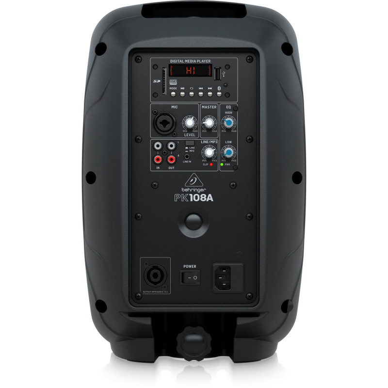 На задней панели встроенный медиаплеер с дисплеем, слотом для SD-карты, USB-портом и приемником Bluetooth. 2-х канальный микшер с отдельными микрофонными / линейными входами, регуляторами громкости и светодиодами перегрузки.