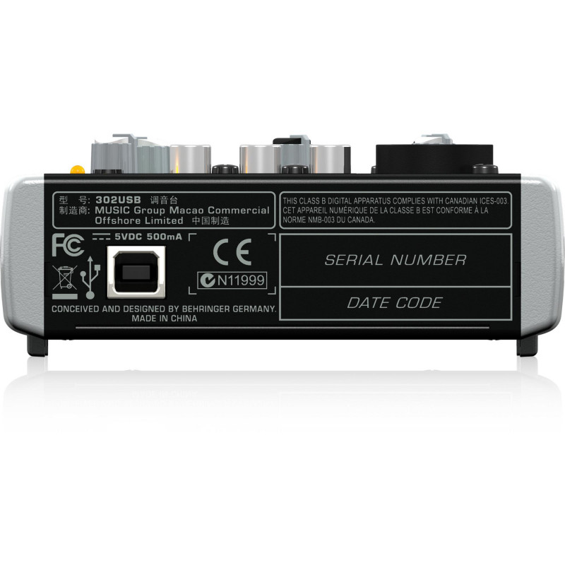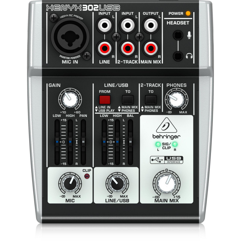Микшер XENYX 302USB имеет 5 входов с одним микрофонным предусилителем XENYX, пульт используется как при записи, так и на выступлениях. Он очень компактный, его легко взять с собой подключив к нему ноутбук, он отлично подходит для домашней студии и занимает мало места на столе. Микшер оснащен комбинированным XLR /Jack разъемом балансного типа, который имеет фантомное питание для подключения конденсаторных микрофонов. Далее имеются 2 линейных стереовхода Line и 2-track на небалансных 4 x RCA разъемах, в них можно подключать плеер, синтезатор, смартфон или любой другой источник сигнала подобного типа. Рядом находится стереовыход микшера Main Mix на разъемах 2 x RCA небалансного типа. В правой секции пульта Headset находится индикатор питания устройства, выход на наушники Jack 1/8" TRS и микрофонный вход Jack 1/8" TRS, для подключения микрофонных гарнитур. Для каналов микрофона, линейного входа или USB входа можно применить трехполосный эквалайзер «британского» типа, фейдеры которого расположены ниже. Рядом с двумя эквалайзерами есть два фейдера, отвечающих за панораму каждого канала. Под микрофонным входом имеется регулятор уровня предусиления Gain, а так же регулятор громкости канала, рядом расположен индикатор перегрузки. Далее находится регулятор уровня линейных стереовходов Line/USB. По центру пульта расположена кнопка From, направляющая сигнал в канал с линейного сигнала или USB аудиокарты. Рядом расположена кнопка To, для переключения маршрутизации выхода в наушники или в мониторы. Рядом расположена еще одна такая же кнопка маршрутизации для канала 2 track. Имеется отдельный регулятор громкости для наушников, индикаторы сигнала правого и левого выходных каналов, регулятор общей громкости Main Mix. На задней торцевой части пульта расположен USB разъем для подключения к компьютеру.