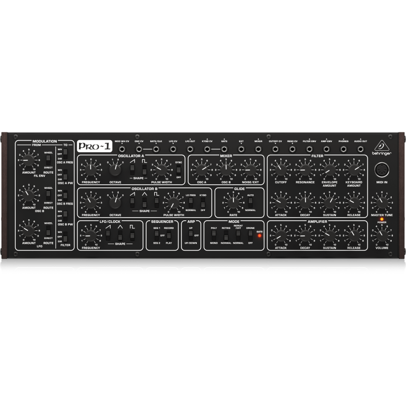 BEHRINGER PRO-1 — доступный ремейк классического монофонического синтезатора Sequential Pro One 1981 года. Схемотехника осталась практически баз изменений, за исключением двух дополнительных CV-разъемов и поддержки USB.
