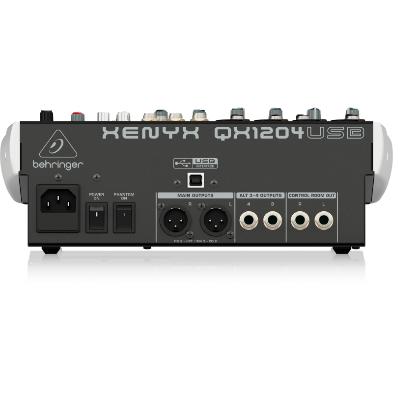 У Behringer XENYX QX1204USB отлично развита система посылов/возвратов. Доступно два посыла на каждый канал: один для мониторинговых приложений, второй – постфейдерный для внешних процессоров эффектов. Всего на борту находится 4 микрофонных входа XLR, 4 линейных моновхода, 2 линейных двухканальных стереовхода и 2 RCA-входа. Выходы представлены разъемами 1/4" TRS Jack на наушники, двумя линейными мастер-выходами на XLR, двумя контрольными TS-выходами, а также двумя RCA-выходами: таким образом, вы можете записывать свой сигнал как с RCA-, так и с TS-, и с XLR-выходов. У каналов есть собственные регуляторы уровня в виде фейдеров с гейном до +10 дБ, ручки настройки баланса и FX post, а на стереофонических каналах можно найти переключатели входной чувствительности +4/-10 дБ, что позволяет подключать как бытовые, так и профессиональные источники звука. Наконец, в основной секции находятся общие ручки посыла и возврата, мастер-фейдеры (отдельно на левый и правый канал), регулятор уровня звука в наушниках и на контрольном выходе, индикатор активности фантомного питания, 12-сегментный общий двухканальный индикатор уровня со светодиодом клиппирования и кнопки посыла на запись и в основной канал.