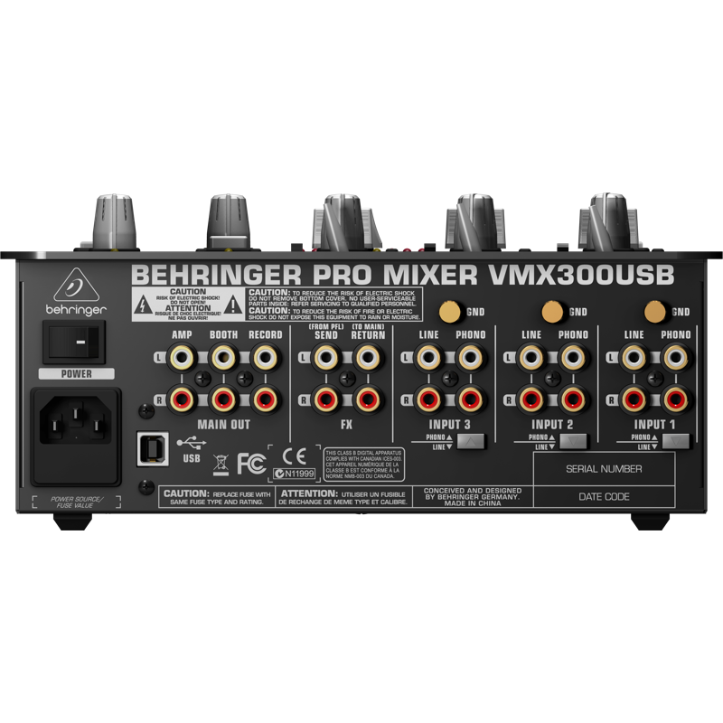 Встроенный четырехканальный аудиоинтерфейс Behringer VMX300USB подключается к компьютеру через разъем USB-B на задней панели и позволяет записывать и воспроизводить музыкальные файлы без каких-либо драйверов, превращая компьютер в звукозаписывающую студию. В комплекте с Behringer VMX 200 USB предлагается программное обеспечение Audacity, Podifier и Golden Ear.