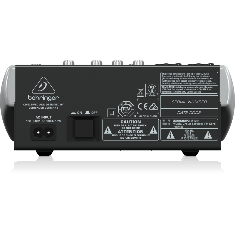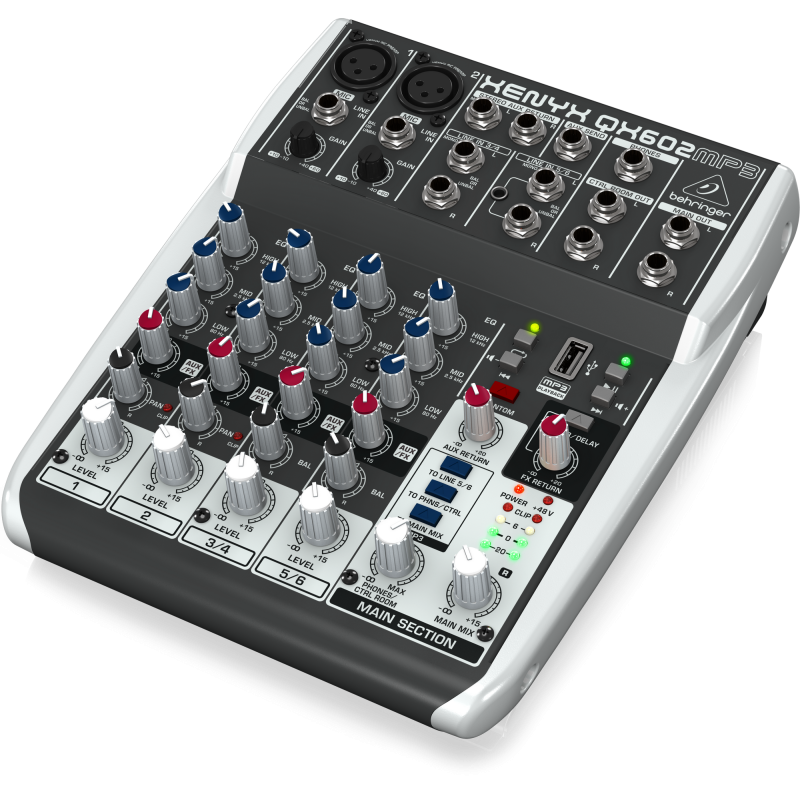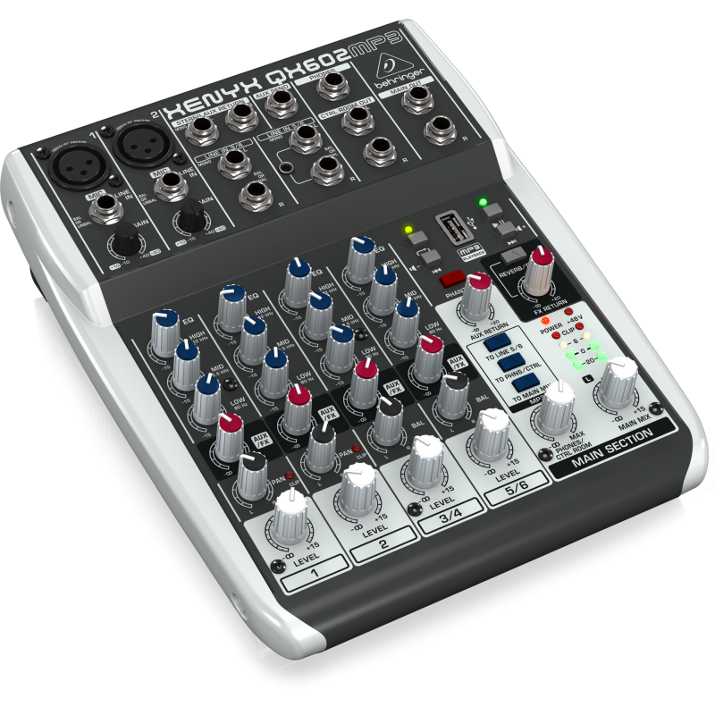 Подключения в Behringer XENYX QX602MP3 представлены двумя микрофонными балансными входами XLR, двумя линейными моновходами и двумя линейными двухканальными стереовходами. Выходы представлены разъемами 1/4" TRS Jack на наушники, двумя линейными мастер-выходами на 1/4" Jack TRS и двумя контрольными TRS-выходами. Кроме того, есть отдельный TRS-выход AUX SEND: это посыл на внешние процессоры эффектов (например, если вы хотите подключить эффекты, которых нет у встроенного процессора). Возврат тоже представлен парой монофонических TRS-входов. На микрофонных входах находятся трехполосные «британские» эквалайзеры в виде ручек и обрезные НЧ-фильтры. У устройства две шины: можно собрать сигналы с одного или нескольких каналов на одну шину.
