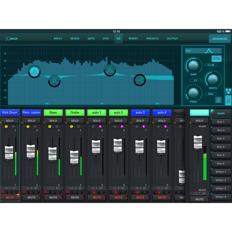 - 100-полосный Real Time Analyzer (RTA) на всех каналах и шине EQ