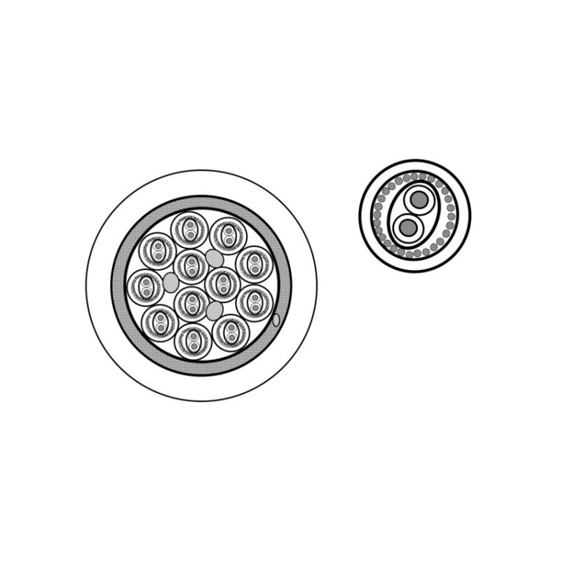 Структура: 12 пар 12х2х0.14 мм2 (2х18*0.10 мм), проводник - витой /луженая медь, AWG 26, диэлектрик проводника - полиэтилен (PE), изоляция пары (FRNC) с цветовой кодировкой и текстом, экран пары - витой, луженая медь (90%), общий экран - плетеный, луженая медь (90%) + провод заземления из луженой меди, t (-30°C +70°C), диаметр кабеля 14.2 мм, оболочка (FRNC/LSZH-C), стандарт: IEC 60332-3-24, 110 Ом