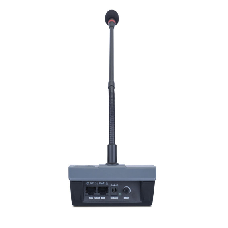 Микрофон имеет интуитивно понятную LED-индикацию и гибкую ножку. Соединение с другими блоками происходит посредством стандартного CTA5 кабеля к задней панели базы. Разъёмы IN и OUT абсолютно идентичны, что делает подключение блока простым и безопасным. На базе микрофона расположена кнопка «talk». Когда микрофон активен, LED-подсветка над кнопкой загорается. Повторное нажатие кнопки «talk» деактивирует микрофон.