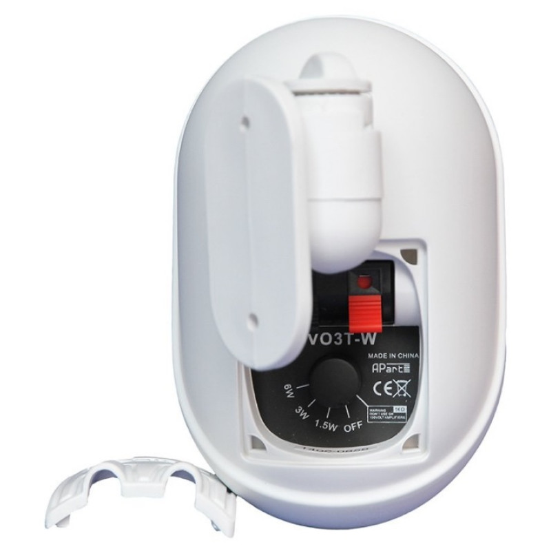 Он оборудован высокоэффективной связкой из 3" НЧ вуфера с бумажным диффузором и 1" ВЧ твитера с мягким шелковым куполом, которые обеспечивают выходную мощность на уровне RMS 20 Вт (peak 40 Вт) при подключении 16 Ом и 6/3/1.5 Вт при работе в линиях 100 В. Для подключения к усилительному оборудованию на задней стенке предусмотрены удобные зажимные клеммы, для выбора режима / выходной мощности – поворотный селектор. АС выпускается в лаконичном корпусе из высокопрочного АБС-пластика с защитной сеткой из стали с порошковым покрытием и предполагает настенный накладной монтаж с применением комплектного наклонно-поворотного кронштейна ли же просто размещение на любой горизонтальной поверхности.
