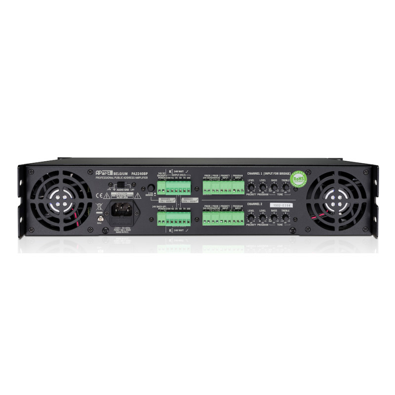 BIAMP PA2240BP - это трансляционный усилитель, рассчитанный на работу в низкоомных сетях 4 Ω или в сетях с постоянным напряжением 35-50-70-100 В.