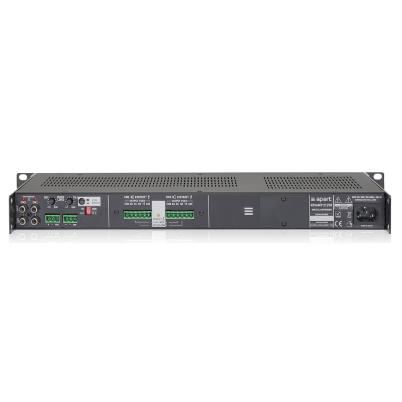 BIAMP REVAMP2120T - это аналог модели REVAMP1120T, но имеет 2 канала с выходными мощностями 2 x 120 Вт (4 Ом) и 2 x 60 Вт (8 Ом).