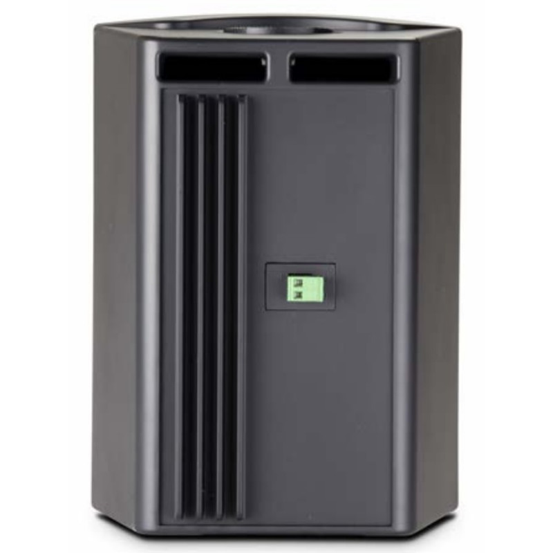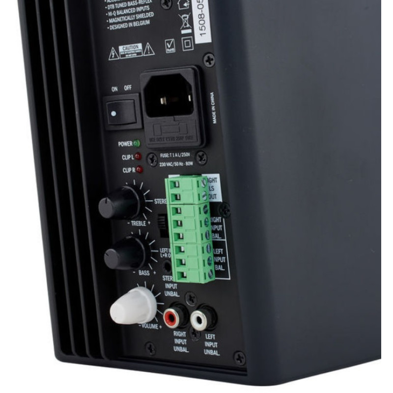 Каждая из АС снабжена высокоэффективной связкой из 5.25" НЧ вуфера с полипропиленовым диффузором и 1" ВЧ твитера с шелковым куполом, которые в паре с встроенным в активную АС усилителем обеспечивают выходную мощность на уровне RMS 2х15 Вт (max 2х30 Вт) и звуковое давление до 101 дБ. Также активный громкоговоритель снабжен стерео аудио входами на 2RCA и mini-jack 3.5 мм, балансным аудио входом на 2хEuroblock 3-pin, поворотными регуляторами настройки тембра Bass/Treble и управления громкостью выходного сигнала. Питание реализовано от стандартной бытовой электросети AC 230 В. Дополнительно предусмотрена система защиты от перегрузок и информативная световая индикация текущего состояния. АС выпускается в лаконичном корпусе из высокопрочного АБС-пластика с защитной сеткой из стали с порошковым покрытием и предполагает настенный накладной монтаж с применением комплектного наклонно-поворотного кронштейна ли же просто размещение на любой горизонтальной поверхности.