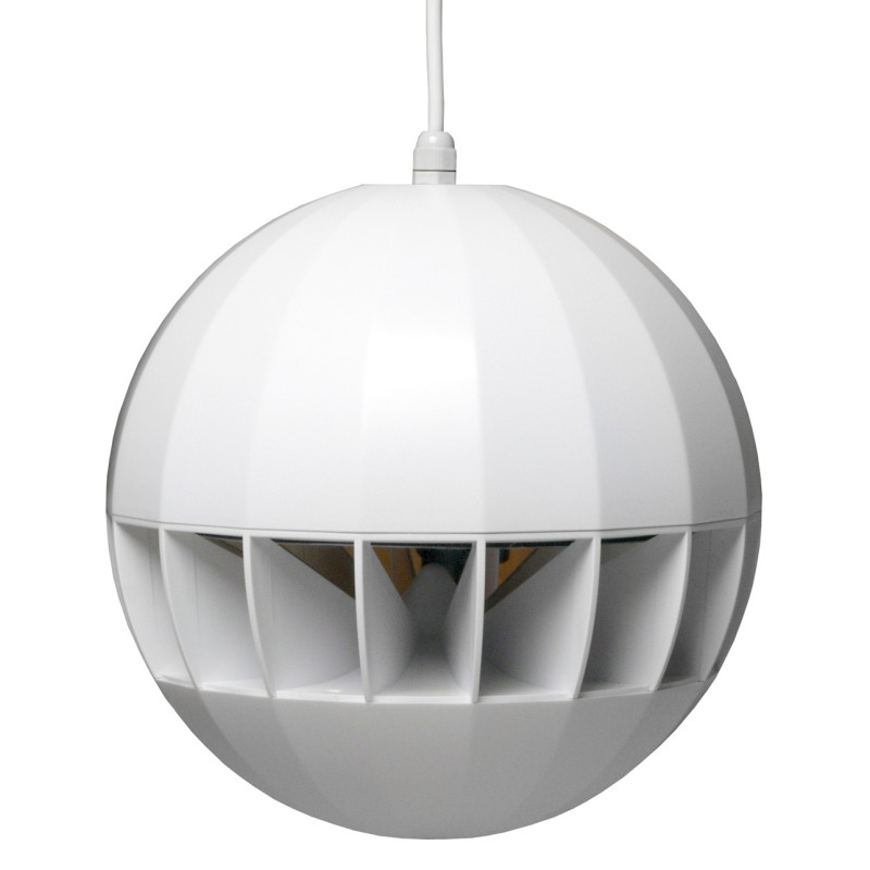Она оборудована высококачественным 8" НЧ динамиком с двойным диффузором, который обеспечивает выходную мощность на уровне RMS 20 Вт (peak 3 Вт) при подключении 8 Ом и 20/10/5 Вт при работе в линиях 100 В. АС изготовлена в шаровидном корпусе из качественного АБС-пластика и защищена по стандарту IP53. Для подключения к акустической линии и крепления к перекрытию предусмотрен усиленный кабельный вывод длиной 3.3 м.