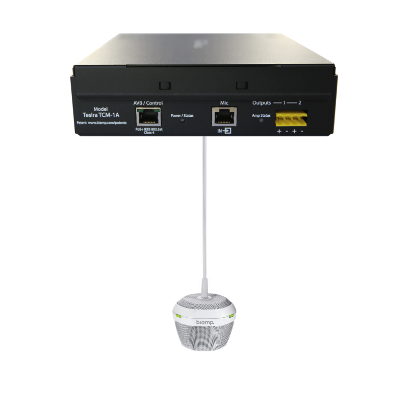 Модель TCM-1A — это потолочный микрофон с поддержкой AVB и усилителем PoE+, предназначенный для использования в системах Tesira. Каждый микрофонный блок, состоящий из запотолочного коммутационного блока и подвесного микрофона, использует технологию направленного звука с тремя 120-градусными зонами, что позволяет обеспечивать полный охват помещения для совещаний на 360 градусов. Микрофон TCM-1A автоматически отслеживает и с помощью интеллектуальных алгоритмов микширует речь всех сидящих за столом, позволяя собеседникам, находящимся на удалении друг от друга, слышать всю беседу естественным образом.