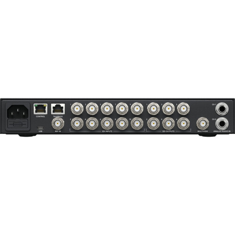 Поддерживая сигналы 3G-SDI и HD-SDI, коммутатор подключается к широкому спектру камер и источников, обеспечивая вывод программ через шесть выходов 3G-SDI BNC или выход веб-камеры через USB Type-C. Кроме того, коммутатор имеет многовидовой выход с возможностью маршрутизации до 16 окон, которые могут отображать входные данные, видео с ключами, графику и кадры из пула носителей, а также выходные данные программы. Каждый вход подключается к встроенному аудиомикшеру Fairlight, поддерживающему до 28 каналов звука.