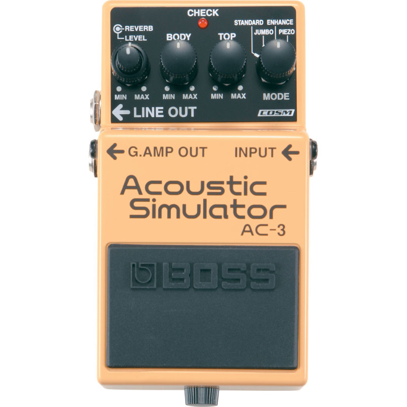 Гитарная педаль эффектов BOSS AC-3 предназначена для моделирования звучания акустической гитары по технологии COSM в четырех режимах: STANDART (звучание гитары Dreadnought), JUMBO (большая гитара), ENHANCE (резкая атака при стандартном тоне), и PIEZO (инструмент, оснащенный пьезо-датчиком).