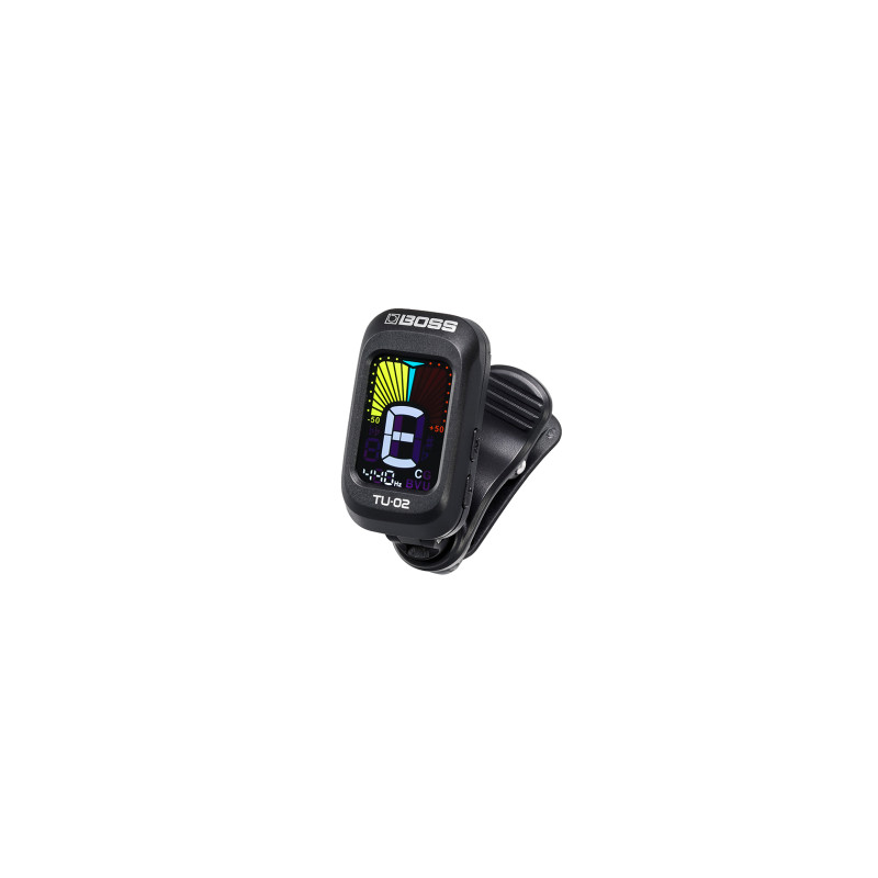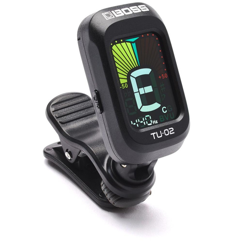 BOSS TU-02 представляет собой портативный хроматический тюнер, представленный в виде устройства, закрепляемого на голову грифа музыкального инструмента.