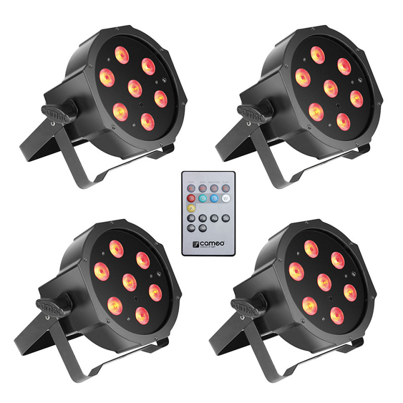 Комплект из 4-х очень плоских, PAR прожекторов с семью высокомощными светодиодами TRI RGB (3-в-1) мощностью 3 Вт, цветовым спектром RGB, углом луча 30 °, богатыми функциями и световыми эффектами. Они работают совершенно бесшумно. Благодаря минимальной тепловой энергии вентилятор не требуется.
