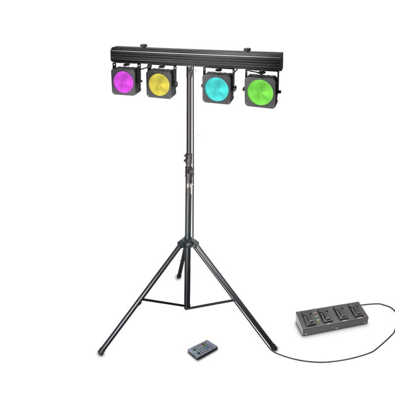 Компактная и легкая профессиональная система освещения, использующая современные светодиодные технологии с чипом на борту, которая чрезвычайно долговечна и энергоэффективна. Четыре плоских PAR-прожектора с углом луча 50 ° - это ультра яркие светодиоды COB LED 30 Вт, предназначенные для интенсивного смешивания цветов RGB и горизонтального и вертикального выравнивания.