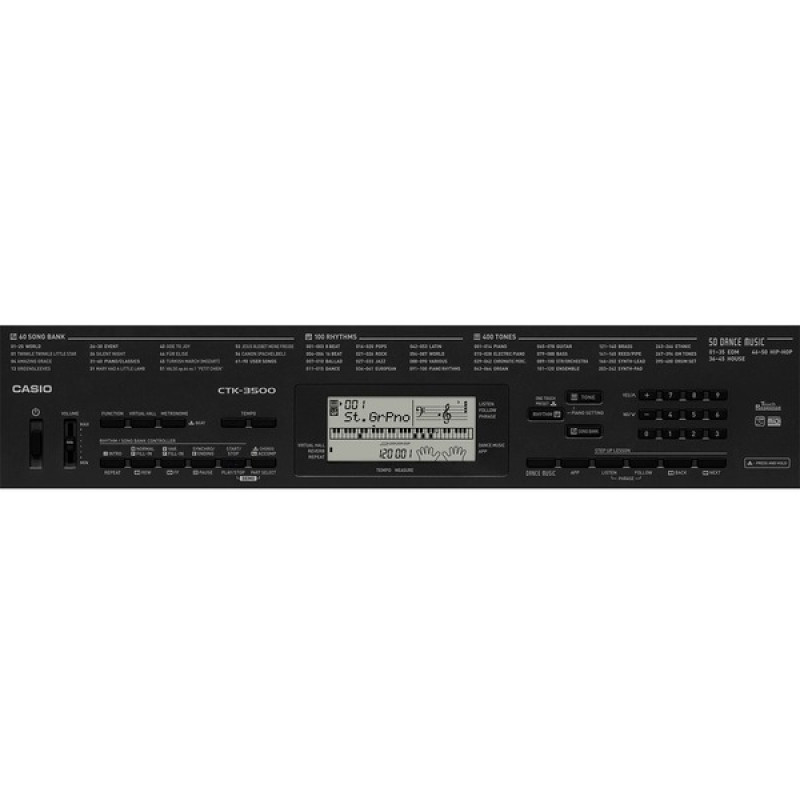 Внутри у синтезатора Casio CTK-3500 зашито 400 тембров и 150 ритмических шаблонов автоаккомпанемента, у которого можно менять темп в промежутке от 20 до 255 ударов в минуту. Встроено 60 композиций, которым можно подыгрывать для обучения или удовольствия. Есть также и MIDI-функционал. Отдельных MIDI-разъемов не предусмотрено, поэтому передача и прием MIDI-сообщений реализованы посредством USB-разъема типа B на тыловой панели. Вы можете использовать данный синтезатор как MIDI-клавиатуру и пользоваться, например, виртуальными инструментами в вашей DAW (секвенсоре). Встроено звукоусилительное и звуковоспроизводящее оборудование, которое представлено двумя динамиками диаметром 10 см и усилителем мощностью 2+2 Вт. В Casio CTK-3500 встроены эффекты реверберации (10 видов) и виртуальный зал. Еще одной особенностью данного инструмента является так называемый режим «Танцевальная музыка»: вы просто прикасаетесь к клавишам и активируете различные банки эффектов и инструментов в ритмичном стиле (см. на видео). Предустановлено 50 типов этого режима.