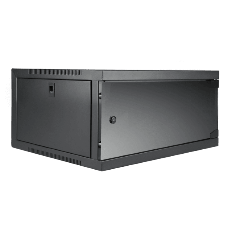 Поставляется полностью в собранном виде и легко монтируется на стену. Конструкция состоит из стальной рамы толщиной 1,5 мм и панелей 1,0 мм. Боковые панели съемные. Встроенная вентиляционная решетка сверху. Вертикальные направляющие с удобной регулировкой по глубине. Отверстие для кабеля сверху и снизу (закрывается). Передняя дверь реверсивная из закаленного стекла с ключевым замком.