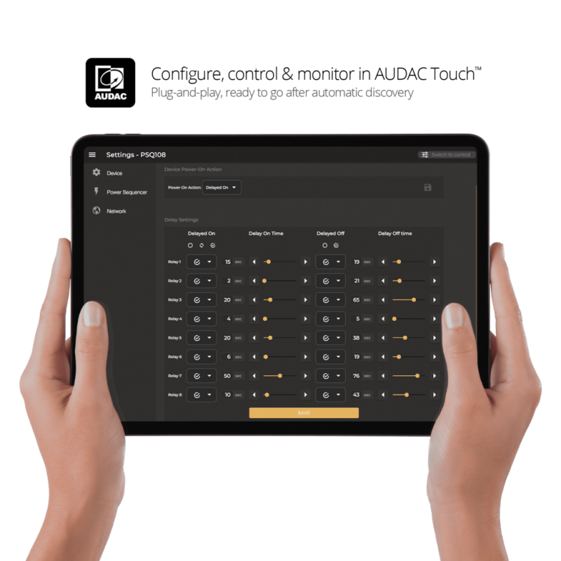 Также есть возможность ручного управления с помощью регуляторов на фронтальной панели. Несколько устройств PSQ108 могут быть соединены последовательно в цепь, так что для управления всеми устройствами потребуется только один IP-адрес. Функция последовательного включения/выключения питания снижает пусковой ток подключенных устройств при включении питания, а с помощью настраиваемого времени задержки можно задать порядок включения устройств. Есть функция мониторинга напряжения и тока. Имеется защита от короткого замыкания и перегрузки по току с помощью автоматического выключателя на 16 А, а также передний порт USB для зарядки (макс. 1000 мА).