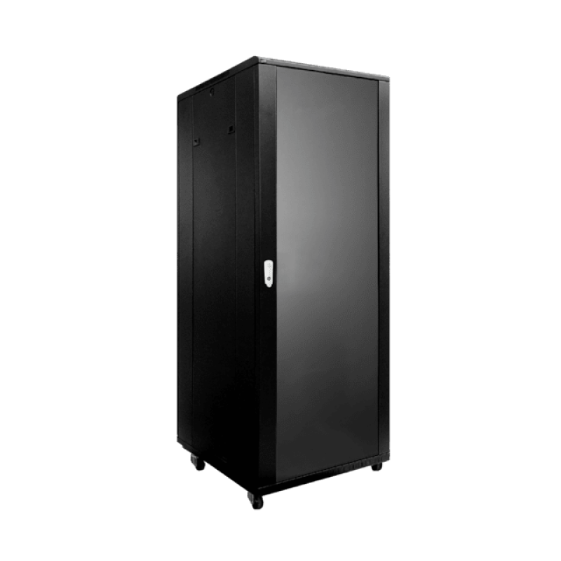 Поставляется в полностью собранном виде включая 50 мм транспортировочные ролики и регулируемые ножки. Рама из 2 мм стали холодного проката и панели из 1,2 мм стали обеспечивают прочную и стабильную конструкцию. Боковые панели съёмные. Вертикальные направляющие с удобной регулировкой по глубине. Передняя дверь реверсивная из закаленного стекла. Встроенная вентиляционная решетка сверху. Задняя и передняя дверь с ключевым замком.