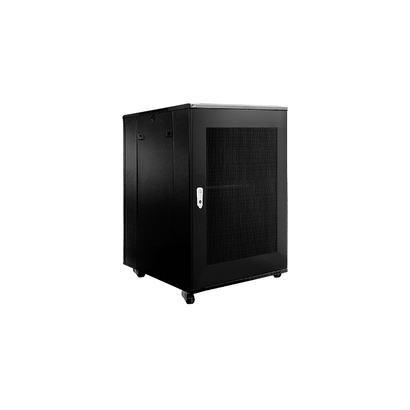 Поставляется в полностью собранном виде включая 50 мм транспортировочные ролики и регулируемые ножки. Рама из 2 мм стали холодного проката и панели из 1,2 мм стали обеспечивают прочную и стабильную конструкцию. Боковые панели съёмные. Вертикальные направляющие с удобной регулировкой по глубине. Шкаф оснащен двумя перфорированными стальными дверьми (спереди и сзади), которые обеспечивают оптимальный поток воздуха через шкаф. Передняя дверь реверсивная. Встроенная вентиляционная решетка сверху. Задняя и передняя дверь с ключевым замком.