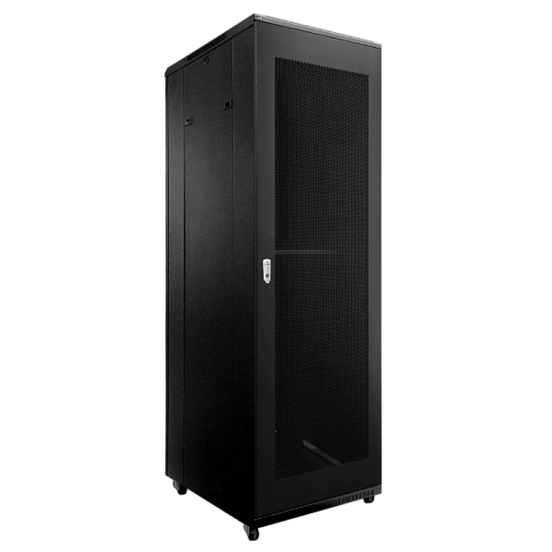 Поставляется в полностью собранном виде включая 50 мм транспортировочные ролики и регулируемые ножки. Рама из 2 мм стали холодного проката и панели из 1,2 мм стали обеспечивают прочную и стабильную конструкцию. Боковые панели съёмные. Вертикальные направляющие с удобной регулировкой по глубине. Шкаф оснащен двумя перфорированными стальными дверьми (спереди и сзади), которые обеспечивают оптимальный поток воздуха через шкаф. Передняя дверь реверсивная, оснащена ключевым замком. Встроенная вентиляционная решетка сверху. Задняя и передняя дверь с ключевым замком.