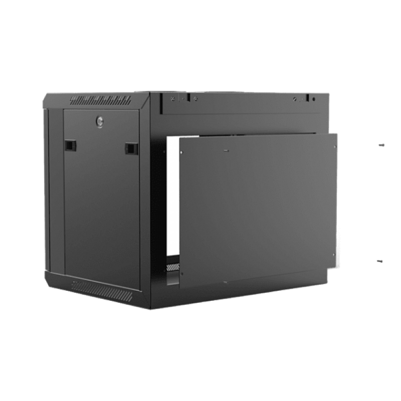 Поставляется в полностью собранном виде. Рама из 1,5 мм стали холодного проката и панели из 1,2 мм стали обеспечивают прочную и стабильную конструкцию. Задняя и боковые панели съёмные. Передние вертикальные направляющие с удобной регулировкой по глубине. Дверь из закаленного стекла с ключевым замком. Встроенная вентиляционная решетка сверху. Снизу, сверху и с задней стороны проёмы для ввода кабельных линий.