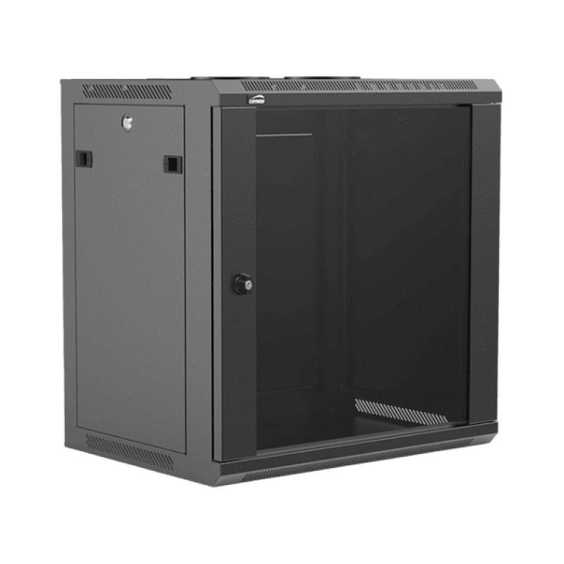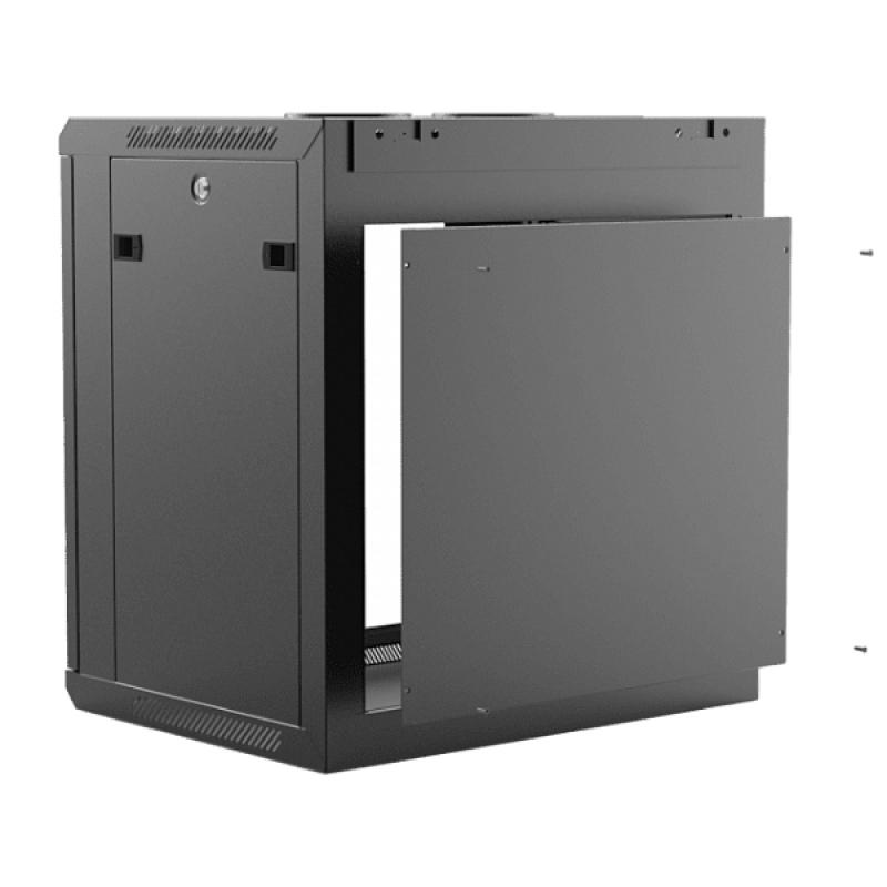 Поставляется в полностью собранном виде. Рама из 1,5 мм стали холодного проката и панели из 1,2 мм стали обеспечивают прочную и стабильную конструкцию. Задняя и боковые панели съёмные. Передние вертикальные направляющие с удобной регулировкой по глубине. Дверь из закаленного стекла с ключевым замком. Встроенная вентиляционная решетка сверху. Снизу, сверху и с задней стороны проёмы для ввода кабельных линий.