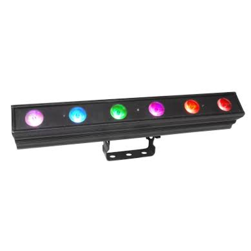 светодиодный линейный светильник с индивидуальным управлением светодиодами. 6х5Вт RGBA-светодиодов, управление DMX 4/6/10/28ch, угол раскрытия 17град, угол засветки 33град, универсальный блок питания 100-240В, потребление до 96Вт, вес 2,3кг, ДШВ 560х65х164мм.