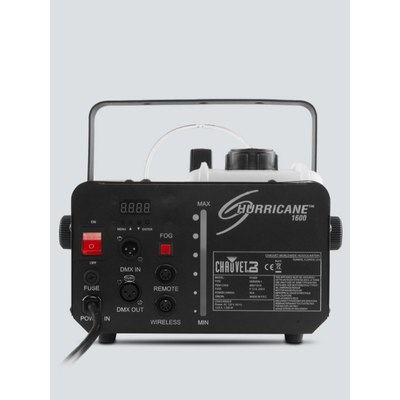 CHAUVET-DJ Hurricane 1600 генератор дыма. Устройство представлено в серии компактных, напольных генераторов, способных выбрасывать плотную струю белого, плотного дыма.