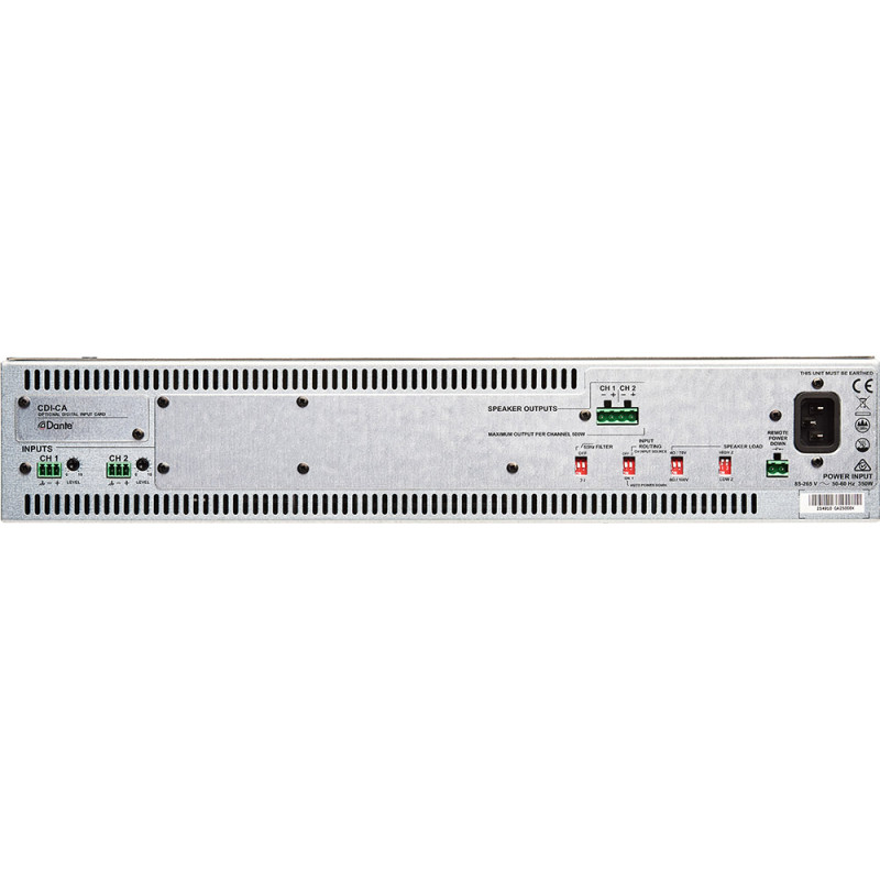 Модель Cloud CA2500 выдаёт 1000 Вт общей мощности, которая равномерно распределяется между двумя каналами (по 500 Вт на каждый). В режиме с высоким импедансом (линия 70/100 В) выходную мощность можно интеллектуально распределять между каналами, что позволяет усилителям максимально экономно работать с различными типами или разным количеством громкоговорителей в любой части объекта.