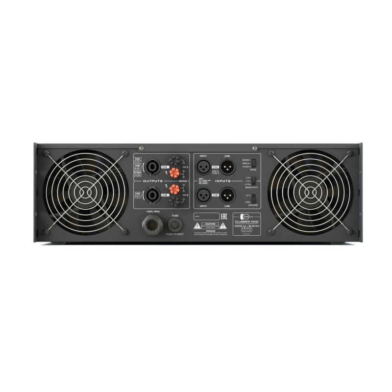 Усилитель имеет два балансных симметричных (Balance In) входа на разъемах XLR. Два балансных линкующих выхода (Link Out) также на разъемах XLR для подключения дополнительного усилителя мощности или других активных звуковых устройств. Чувствительность входа может настраиваться с помощью селектора на три положения 1,4V, 1V и 0,775V. Акустические системы могут быть подключены на выбор к клеммным зажимам или к разъемам SPEAKON. Усилитель может работать в трех режимах: STEREO - два раздельных канала усиления (Ch1 / Ch2) c раздельной регулировкой уровня громкости / PARALLEL - на два канала подается один сигнал с канала Ch1. Регулировка громкости раздельно для каждого канала / BRIDGE - два спикерных выхода суммируются, соответственно увеличивается мощность. Усилитель работает как одноканальный. Регулировка громкости производится с канала Ch1. Выбор режима работы усилителя производится с помощью специального селектора с задней стороны корпуса. В режиме STEREO и PARALLEL Clubber-650 может работать с сопротивлением нагрузи от 4x до 8ми ohm. В режиме BRIDGE допустимая нагрузка – 8ohm. Мощность CVGaudio Clubber-1000 в режиме PARALLEL и STEREO - 4ohm - 1500W x 2 / 8ohm - 1000W x 2, в режиме BRIDGE - 8ohm - 2500W.Стильный металлический корпус имеет высоту 3U и может быть установлен в монтажную стойку. Крепежные “уши” в стойку являются неотъемлимым элементом корпуса. На лицевой стороне располагается информационный жидкокристаллический экран, выводящий информацию о температуре нагрева радиатора выходного каскада усилителя и уровень громкости раздельно для каждого канала. Также на лицевой панели находятся непосредственно регуляторы уровня громкости и светодиодная индикация – наличие входящего сигнала - SIG, перегрузка – CLIP, сработка защиты - PROT, индикатор включения питания и активация режимов работы - PARALLEL или BRIDGE. Усилитель имеет постоянное активное охлаждение. Предусмотрены все необходимые системы защиты - защита от короткого замыкания, перегрузки, перегрева, защита по электропитанию с предохранителем. Усилитель имеет софт-старт и задержку подключения спикерного выхода на время переходных процессов при включении. Благодаря до мелочей продуманной схемотехнике и высокому качеству используемых компонентов работа CVGaudio Clubber - 1000 (при соблюдении правил эксплуатации) будет безупречной в течении всего срока службы устройства.