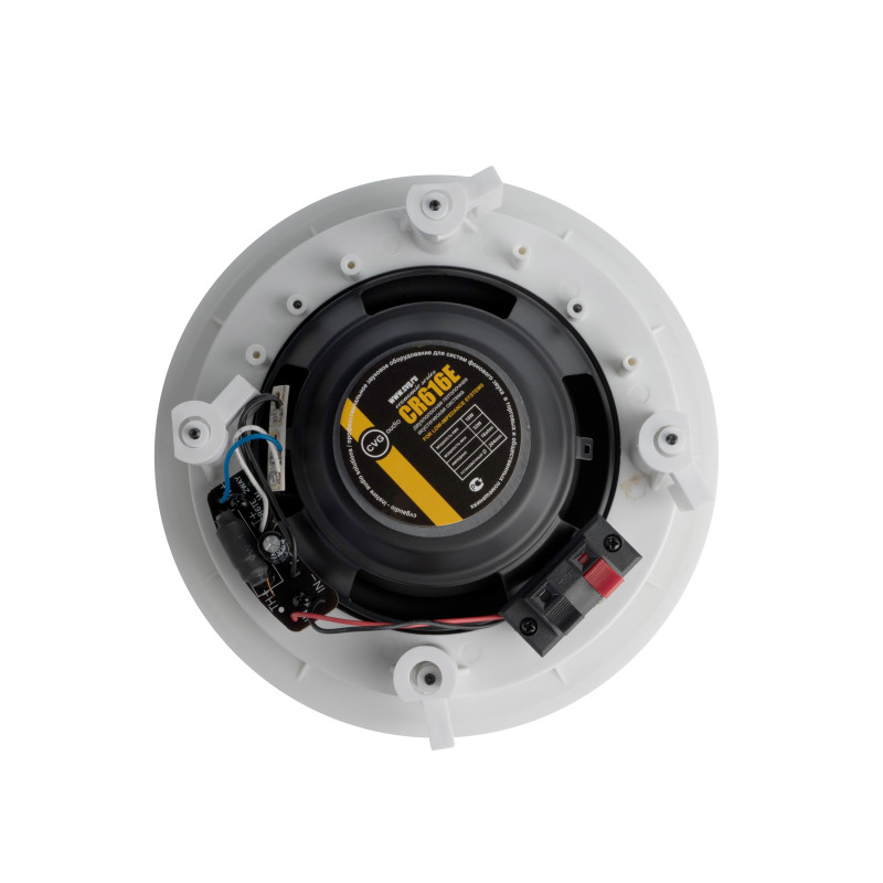 CR626E работает в режиме 16 Ом и совместим только с низкоомными трансляционными усилителями, а также бытовыми интегральными усилителями и ресиверами. Идеально подойдет для трансляции фоновой музыки или передачи речевых сообщений на объектах с ограниченным бюджетом (офисы, магазины, кафе и т.п.). Монтаж осуществляется в подвесной потолок типа «Армстронг» или ему подобный, при этом не понадобится особых знаний, навыков и инструментов. Громкоговоритель фиксируется в посадочное отверстие специальными поворотными зажимами, при этом кабель подводится к самозажимной клеммной колодке типа euroblock (детальную схему подключения смотрите ниже).