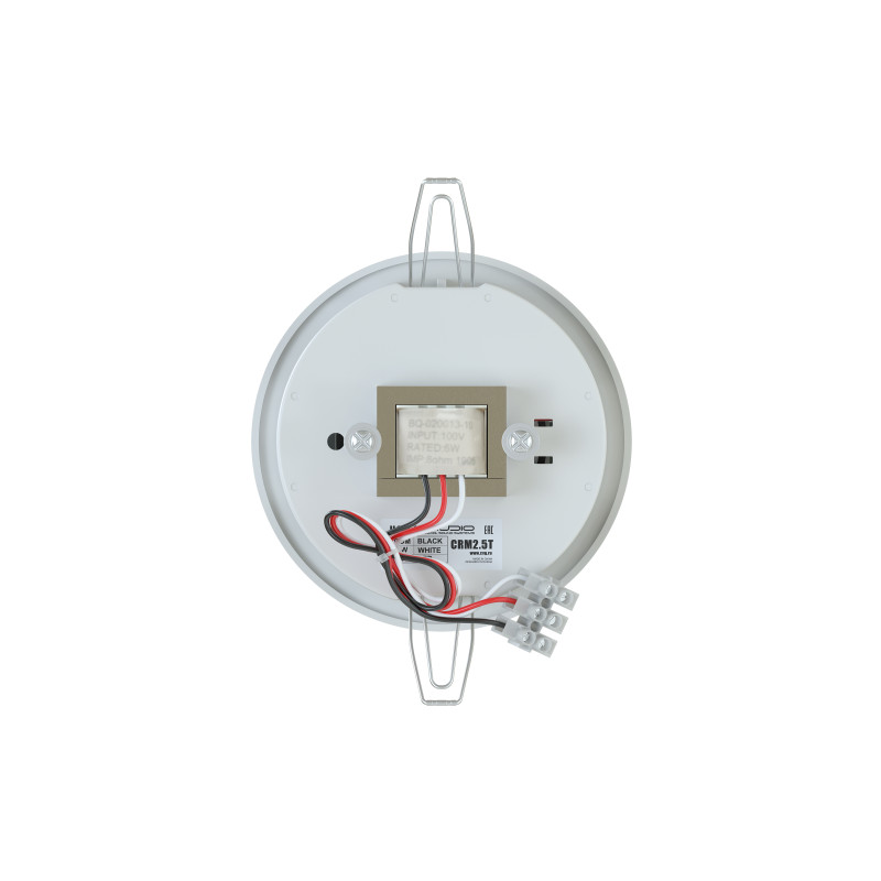 Акустические системы CVGaudio CRM2.5T предназначены для работы в составе 100V трансляционных линий. С обратной стороны корпуса динамика установлен согласующий трансформатор с возможностью подключения акустической системы на одну из двух доступных мощностей – 3W и 6W в режиме 100W. Спикерный кабель подключается с помощью надежного кабельного терминала под винт (фиксируется с помощью отвертки). Для фиксации корпуса динамика в потолок используются два подпружиненных зажима. Установка акустической системы в подвесной потолок займет у вас считанные секунды. Необходимо просто вставить динамик в подготовленное отверстие, распорные зажимы автоматически зафиксируют корпус в отверстие. Не рекомендуется устанавливать CRM2.5T в подвесной потолок толщиной меньше 1см и потолок из недостаточно плотного материала (некоторые модели потолочных плит Армстронг). Крепление оптимизировано для стандартного гипсокартона или фанерного листа.