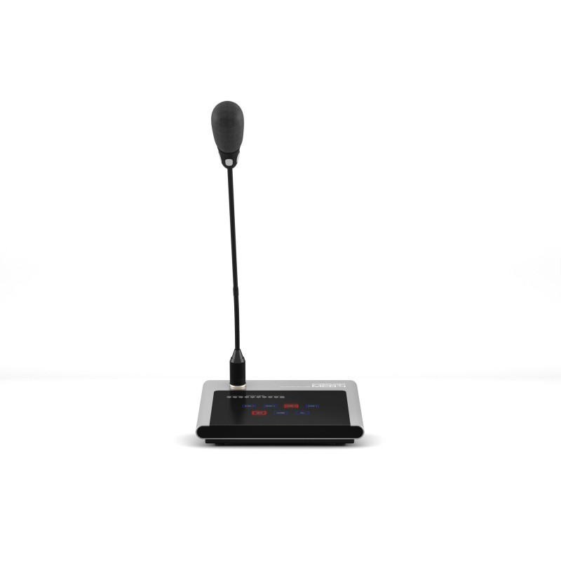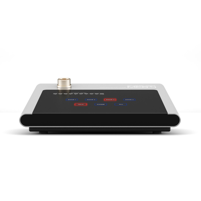 Корпус микрофонной консоли выполнен из прочного алюминиевого сплава с пластиковыми вставками. Лицевая панель – из специального, стойкого к потертостям и царапинам полимерного стекла. Для управления используются сенсорные кнопки с подсветкой. Доступна раздельная активация каждой из четырех зон и также режим активации всех зон одновременно. Отдельно выведены кнопки TALK – включение микрофона для подачи сообщения и CHRIME – запуск сигнала привлечения внимания. В консоли защиты два варианта сигнала CHRIME, меняются с помощью селектора на задней панели консоли. Там же находятся регуляторы уровня громкости сигнала CHRIME, громкость микрофона и суммарная громкость MASTER. Это позволяет тонко настроить необходимый уровень сигнала и баланс между громкостью микрофона и CHRIME.