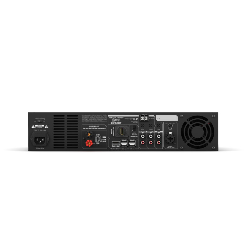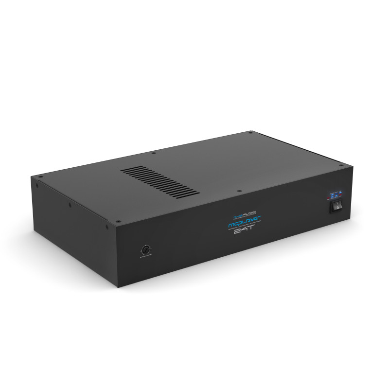 CVGAUDIO MCplayer 24T работает только с 100V акустическими системами, возможность работы с LOW-IMPEDANCE акустикой (4/8/16ohm) не предусмотрена. Мощность усилителя - 24W/100V. Усилитель выполнен в небольшом металлическом настольном корпусе. При необходимости установки в монтажную стойку – в стандартный комплект поставки входят рековые "уши" (2U). Усилитель имеет активное охлаждение, включение и скорость вращения вентилятора зависят от температуры нагрева радиатора выходного каскада усилителя. Снабжен всеми необходимыми видами защиты - перегрузка, перегрев, короткое замыкание, предохранитель по питанию.