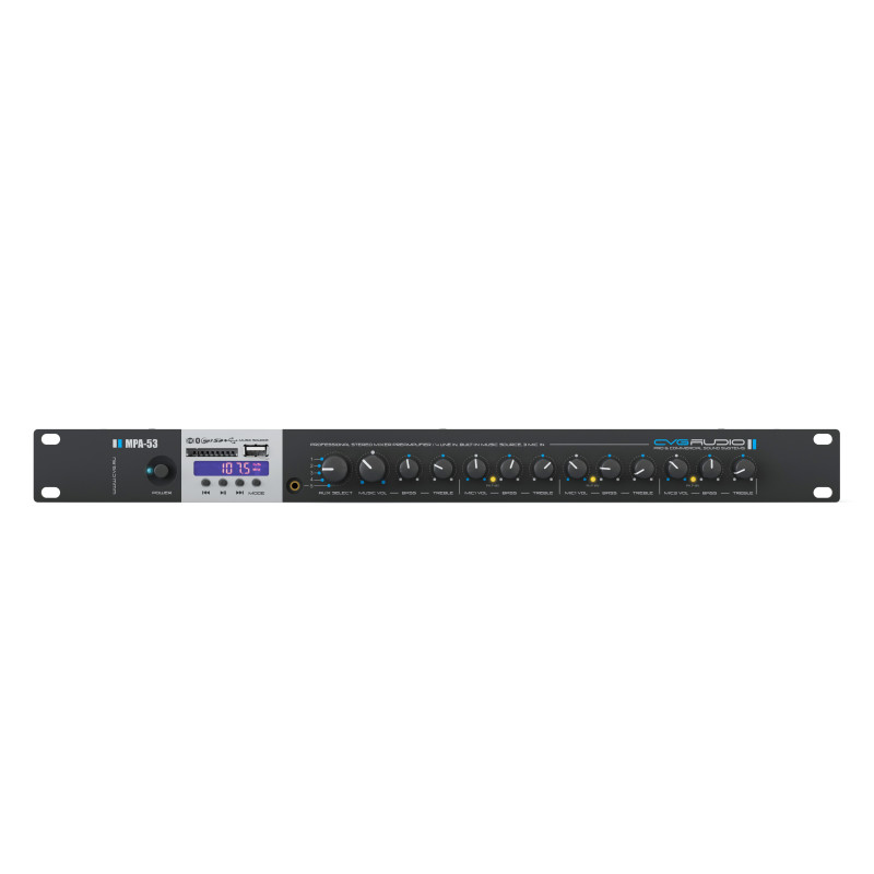 Прибор используется для микширования нескольких входящих сигналов с возможностью индивидуальной настройкой уровня громкости и частотной коррекцией (графический двухполосный НЧ/ВЧ эквалайзер) и дальнейшей подачей на выход CVGAUDIO MPA-53 суммарного стереофонического балансного или не балансного звукового сигнала. Дополнительным очень значимым плюсом устройства являет наличие встроенного модуля-плеера с возможностью воспроизведения контента с подключаемых к нему USB/SD флешь накопителей объемом до 32Gb, наличием Bluetooth приемника для работы с внешними мобильными звуковыми устройствами (смартфоны, планшеты, плеера, ноутбуки и так далее) и AM/FM тюнера с внешней антенной для более уверенного приема. CVGAUDIO MPA-53 имеет три MIC/LINE балансных входа на универсальных комбо-разъемах XLR/TRS 6,3mm с возможность индивидуально задать приоритет над линейными входами и сигналом с встроенного модуля-плеера. Также предусмотрено пять селективных стерео линейных небалансных входов - активен может быть только один выбранный с помощью селектора AUX SELECT на лицевой панели устройства. Четыре входа AUX IN1/2/3/4 - 2хRCA находятся на задней и пятый stereo miniJack TRS 3,5mm на лицевой. При выборе на селекторе AUX IN 5 и отсутствии подключения к данному входу внешнего коннектора - активным будет встроенный модуль-плеер, если коннектор подключен к разъему AUX IN 5, то сигнал будет браться с разъема AUX IN 5. Все микрофонные входа микшируются между собой и с выбранным линейным входом или сигналом с модуля-плеера. Для всех трех микрофонных входов можно задать индивидуальную громкость и также скорректировать высокие и низкие частоты с помощью двухполосного графического эквалайзера. Для AUX входов имеется один регулятор громкости и двухполосный эквалайзер с помощью которых настраивается активный линейных вход AUX или встроенный модуль-плеер.