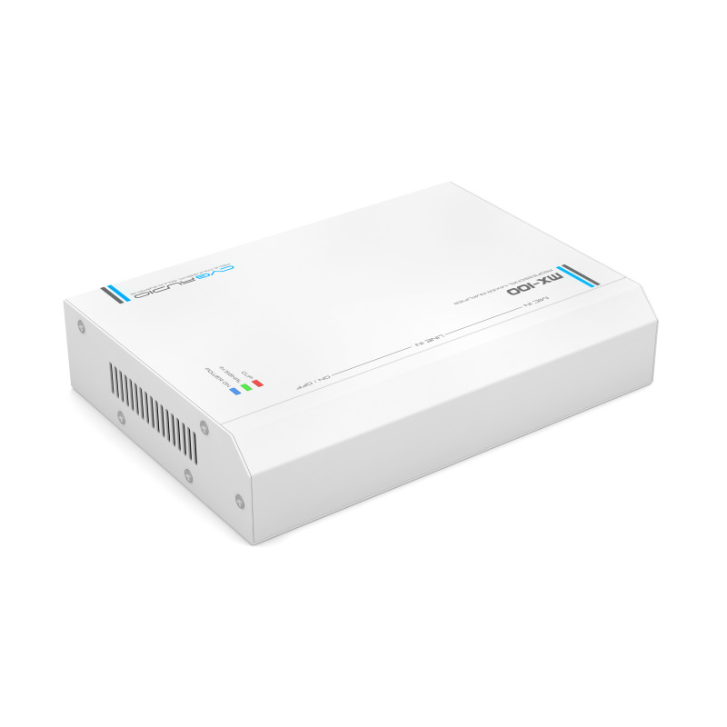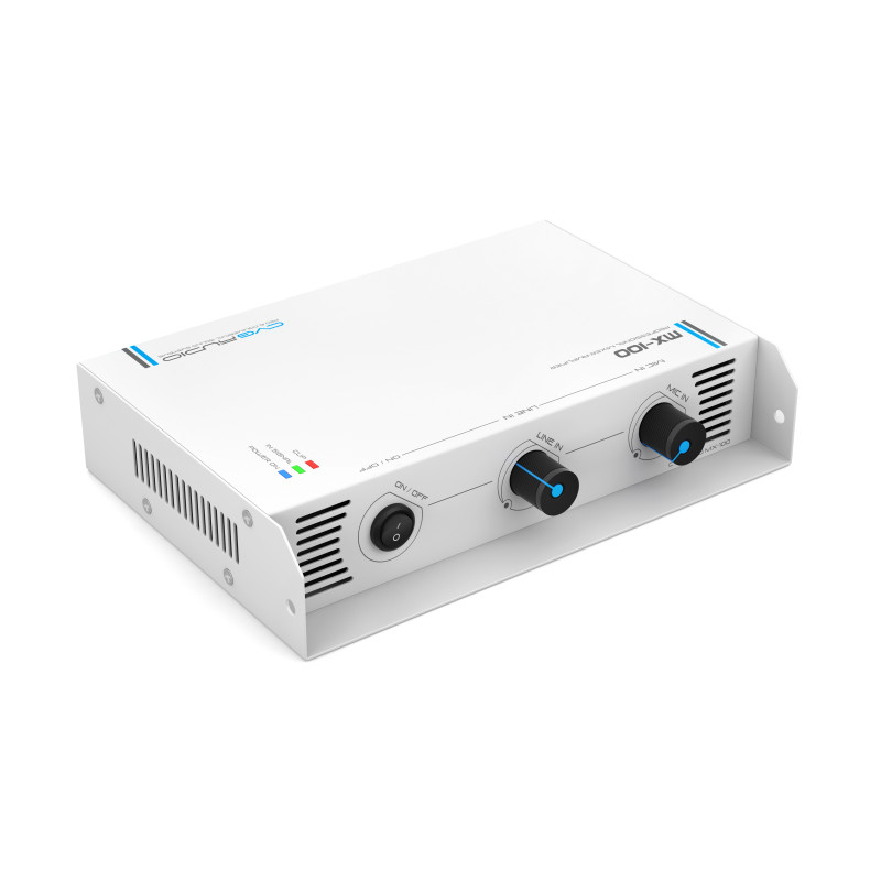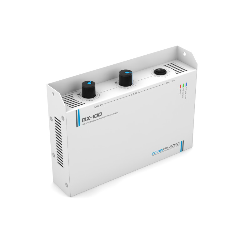 CVGAUDIO MX-100 – миниатюрный двухканальный D-class low-impedance микшер-усилитель с возможностью настенной установки и блокировкой панели с элементами управления. Идеальное решение для простой, но в большом количестве случаев функционально достаточной звуковой системы в учебных аудиториях и классах, офисных переговорных, детских игровых комнатах, небольших лекториях и так далее. Также данная модель найдем широкое применение для создания систем фоновой музыкальной трансляции в помещениях площадью до 80m2. Усилитель двухканальный, на каждый канал можно подключить до трех параллельно соединенных 16ohm акустических систем небольшой мощности (например CRX516 / CRX616 / CRX816 / RF416TW / RF416TBL в 16ohm режиме) или по две параллельно соединенных 8ohm акустических системы (например CL608 / CX408 / CX508 / CX608 / TXR608 / TXR808 / ODF408T в 8ohm режиме). Корректный диапазон суммарного номинального импеданса нагрузки на каждом канале усилителя от 4-х до 8-ми ohm. MX-100 имеет один линейный и один микрофонный вход. Линейный стерео не симметричный вход реализован на двух типах разъемов – 2RCA и 3-pin Euroblock. Микрофонный вход балансный, могут подключаться как динамические, так и конденсаторные микрофоны. Для работы с конденсаторными/электретными микрофонами предусмотрено включение фантомное питание 24W. Тип входного разъема для микрофона 3-pin Euroblock, совмещен в одном коннекторе с линейным входом. На лицевой (верхней панели) расположены два регулятора громкости - раздельно для микрофонного входа и линейного. При этом на задней (нижней) панели также предусмотрены регуляторы чувствительно с помощью которых можно ограничить максимальную громкость каждого входа и исключить перегрузку по входу при слишком мощном приходящем сигнале от источника (плеера). Там же расположен двухполосный графический эквалайзер для частотной коррекции суммарного сигнала. Для сопряжения с системой аварийно-пожарного оповещения в MX-100 предусмотен контакт EXT.MUTE. При замыкании данных контактов усилитель полностью мьютируется. Таким образом при возникновении аварийной ситуации по сигналу от пожарного модуля может быть настроено автоматическое отключение локальной трансляции. Сейчас данный функционал стал обязательным при использовании локальных звукоусиливающих устройств в общественных помещениях.