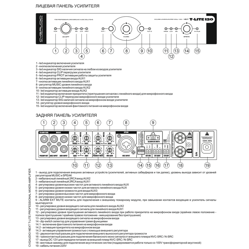 | LINE IN | 2х2RCA / Aux in1 имеет возможность подключения внешнего плеера CVGAUDIO NVC-SRC / N-SRC через порт EXT-AUX1 |